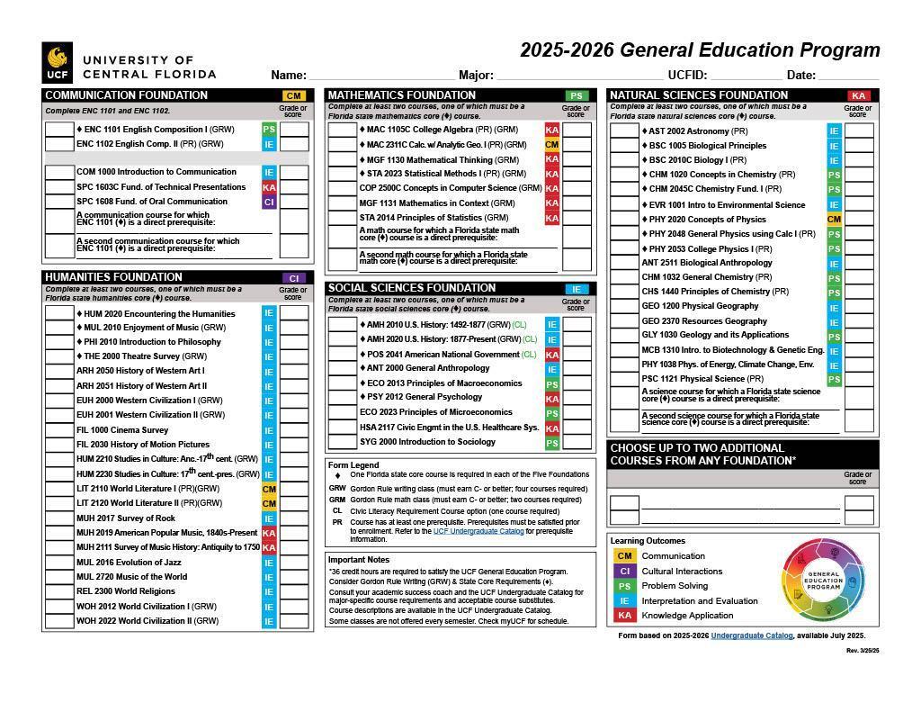 The 2025–26 GEP Worksheet is now available and can be accessed on the GEP webpage and from the Faculty Learning Webcourse. It applies to students who begin to take classes at UCF in Summer 2025 or later.